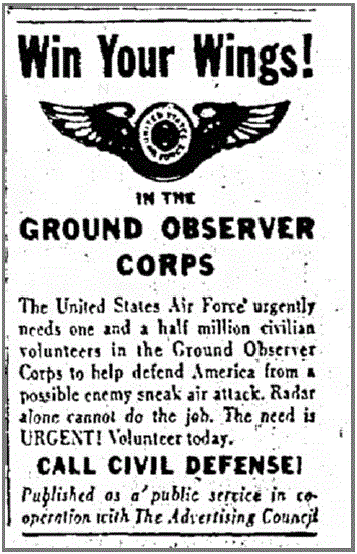 That’s an incredible amount of advertising, especially the money spent. I need to see how that compares to other ads of the time. A simple newspaper search for “Ground Observer Corps” during the 1950s will return thousands of ads in addition to public interest stories and other snippets. It’s easy to see the effect of the Ad Council’s work.